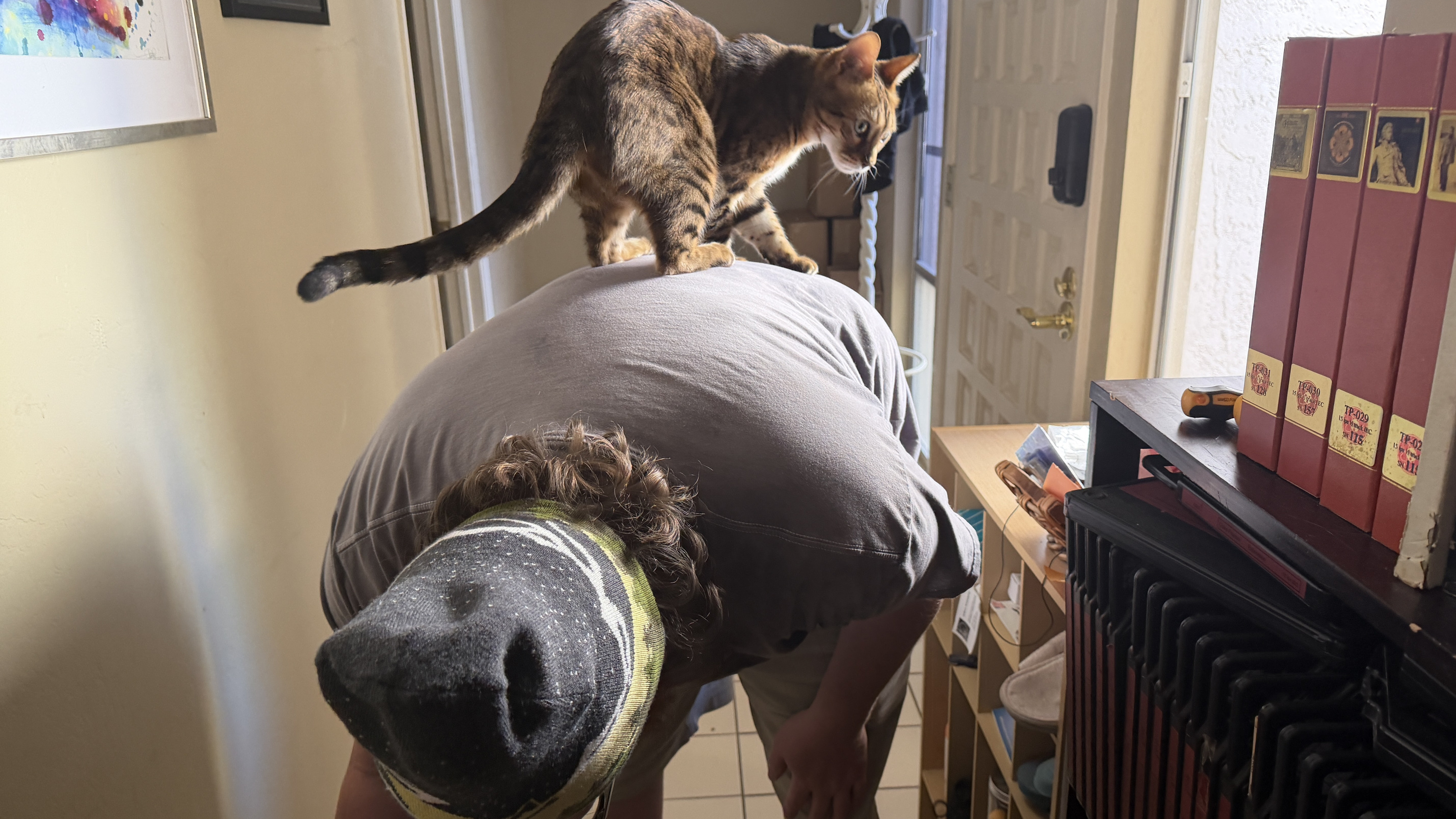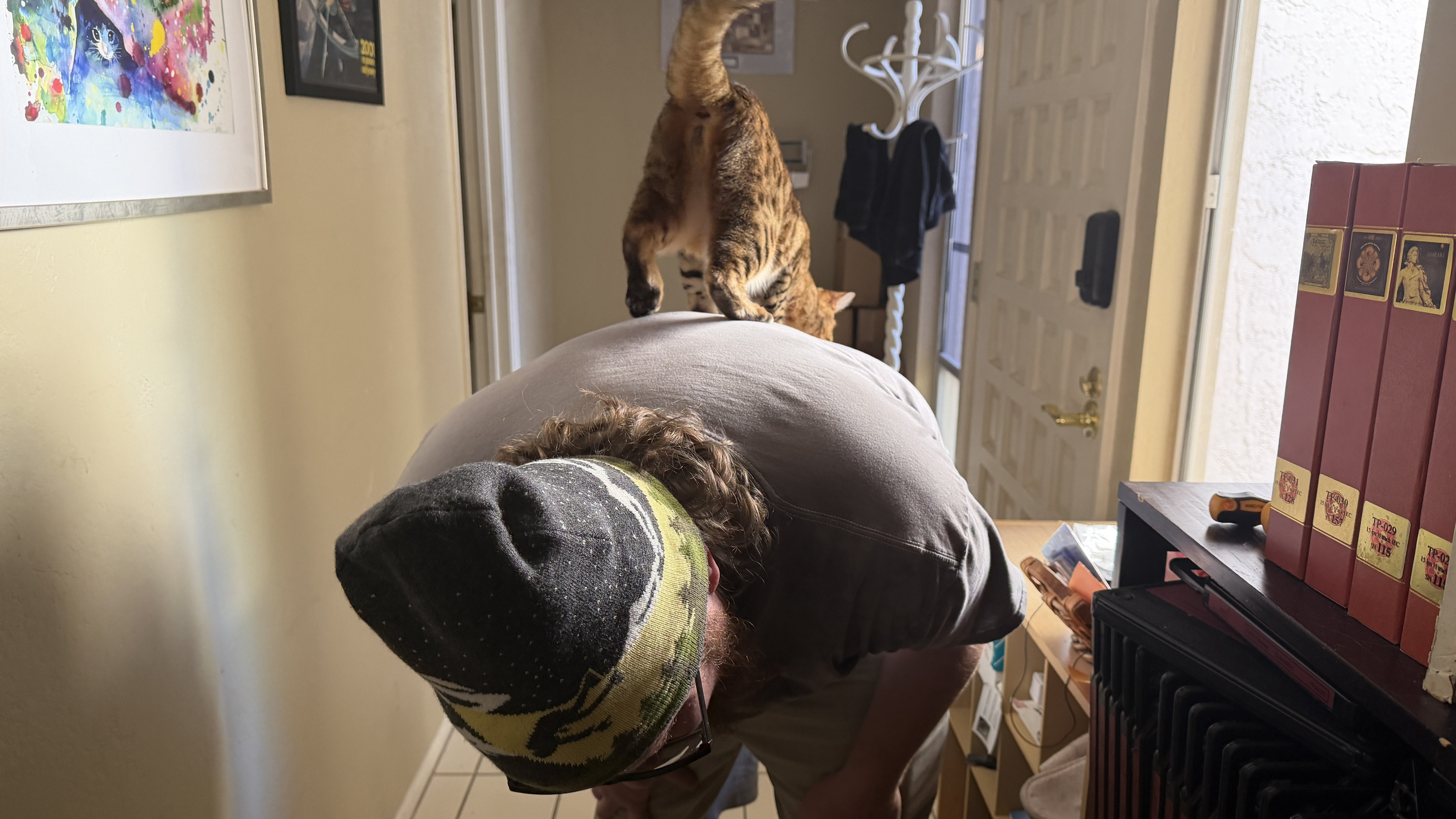 Noah and cat Pickle on his shoulders Noah and cat Pickle