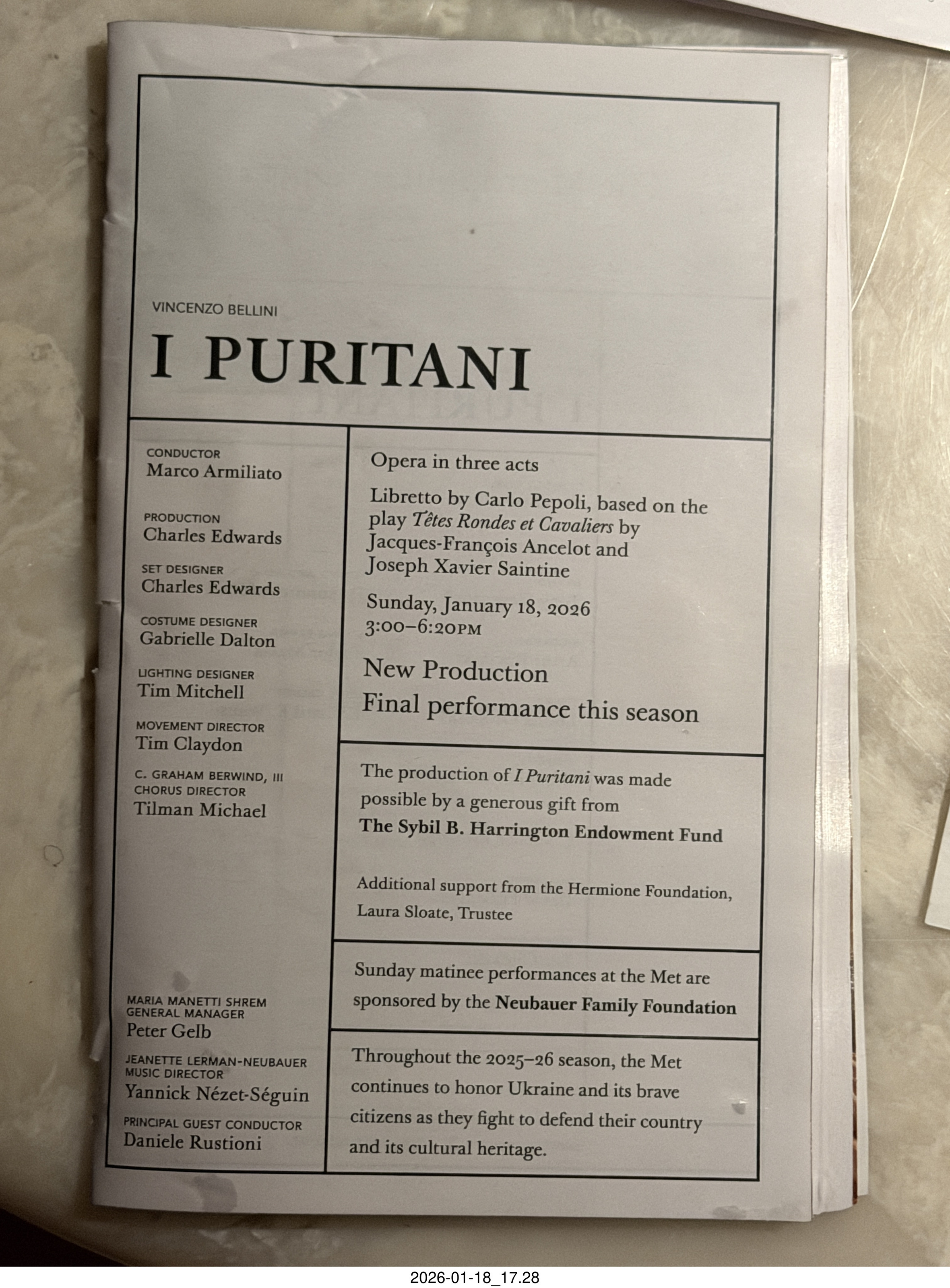 2026 January 20, Tuesday, crl-7pa.jpg * New York City - Manhattan - Lincoln Center - Metropolitan Opera - I Puritani - program