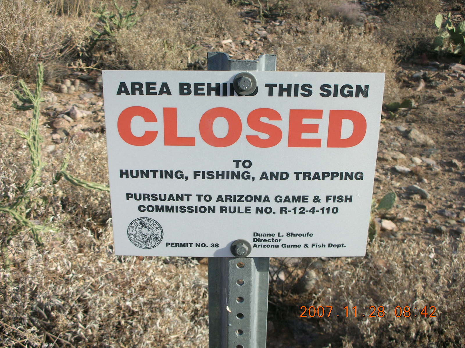 new camera picture of picture 'Area behind this sign CLOSED to hunting, fishing, and trapping' sign.