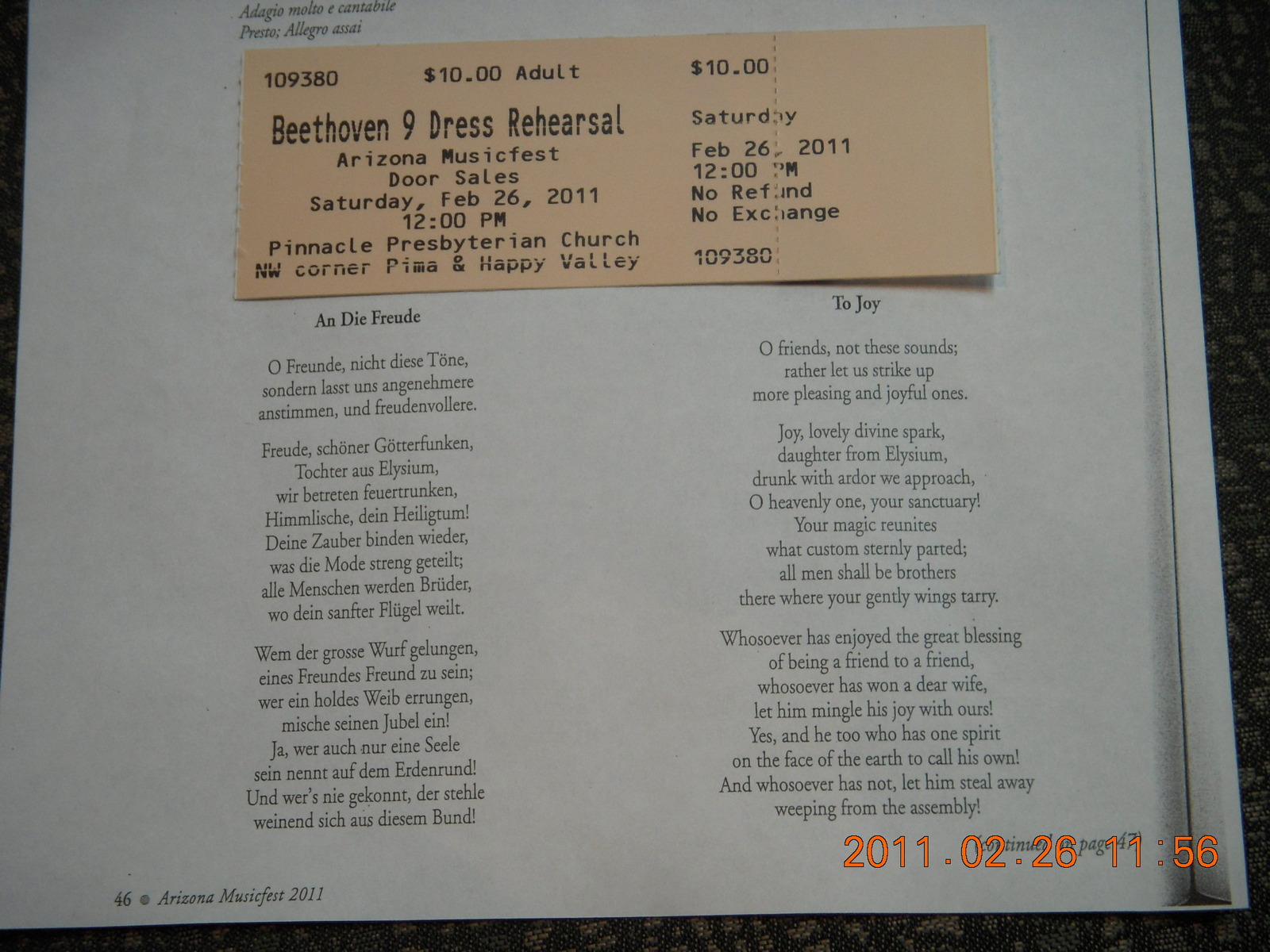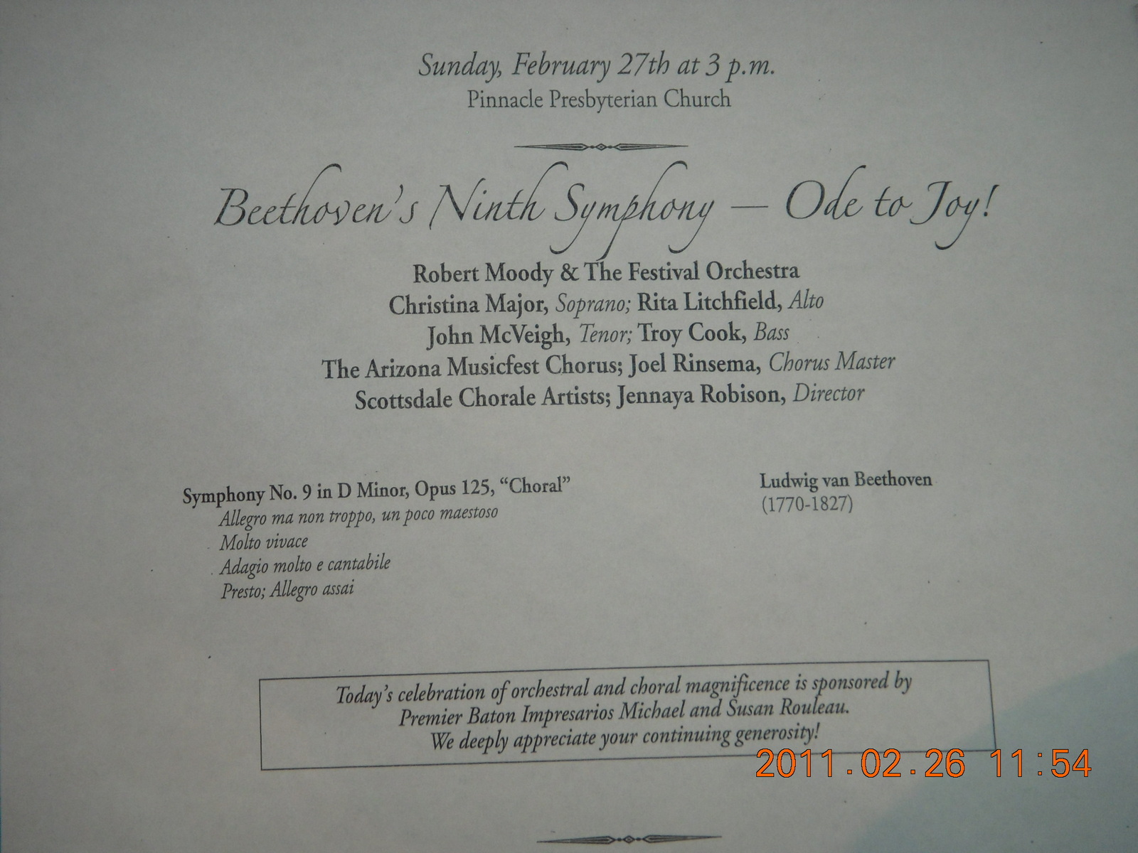 9. Beethoven #9 orchestral rehearsal at Pinnacle Presbyterian - program